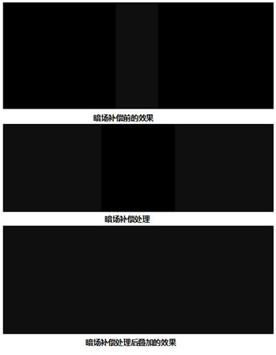投影機(jī)的漏光,是指投影圖像為全黑色的時(shí)候,投影機(jī)仍舊有一部分光線能投射到投影幕上。這樣兩臺投影疊加以后,在純黑場的時(shí)候會(huì)出現(xiàn)一個(gè)中間亮帶。融合器需要用提升非疊加部分光強(qiáng)的方式,來抵消亮帶,這一個(gè)過程為暗場補(bǔ)償。